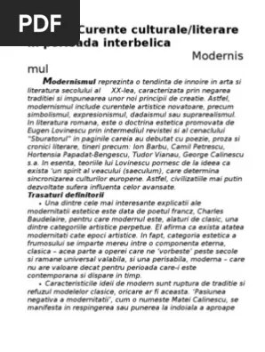 29/05/2012 · modernism în literatura română, în perioada interbelică. Caracteristicile perioadei interbelice în literatura română. In aceasta perioada au aparut numeroase reviste si tendinte in evolutia literaturii : Perioada interbelica in literatura romana perioada interbelica a avut un rol important pentru literatura deoarece a contribuit la dezvoltarea, si in acelasi timp la modernizarea ei. In perioada interbelica disputele literare duc in jurul modernismului si al traditionalismului.